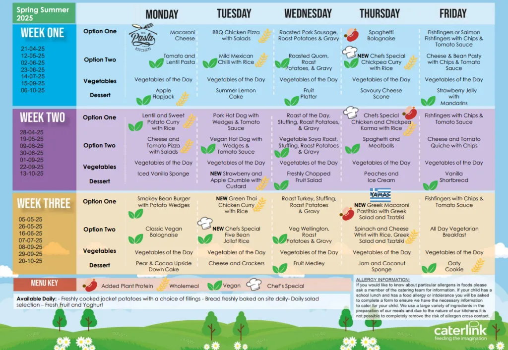 Our delicious school meals are prepared on site by our dedicated catering team, through our catering company, Caterlink. The menu, provided below, offers a selection of delicious, nutritious meals which staff and the children thoroughly enjoy.